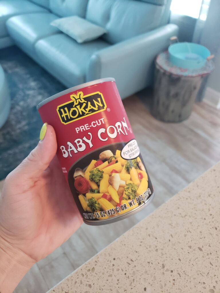 - Open and drain the baby corn – put 1/2 in