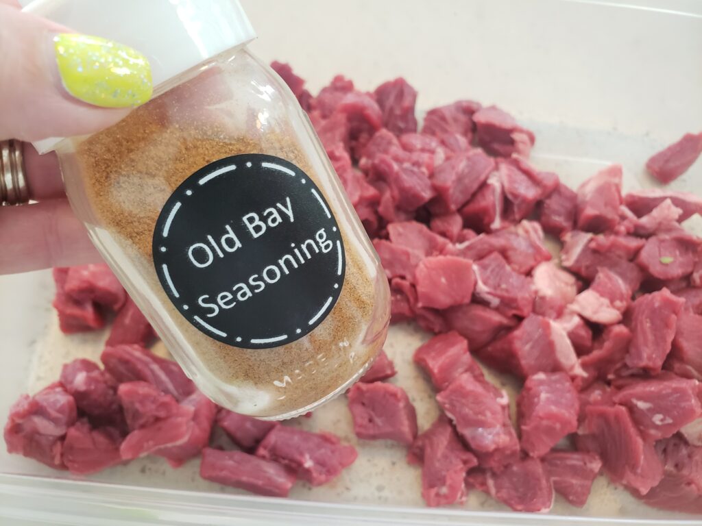 OLD BAY – This is our go to spice for meat. Generously sprinkle the meat with it and stir it around, maybe add a bit of black pepper.