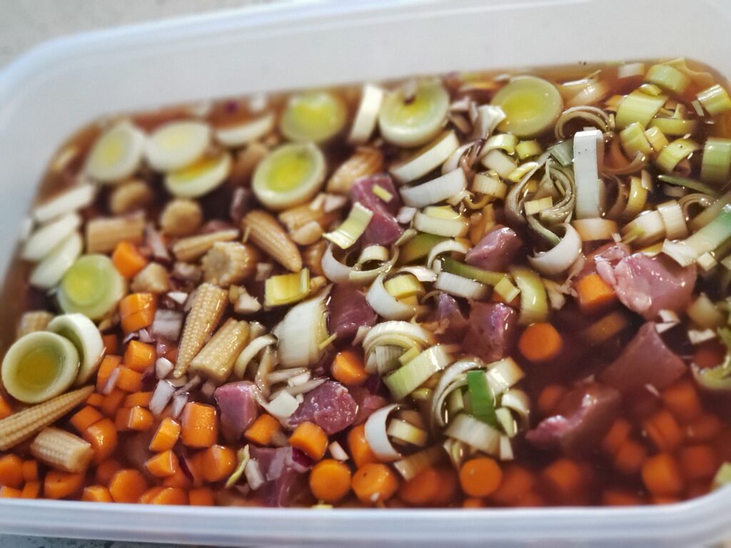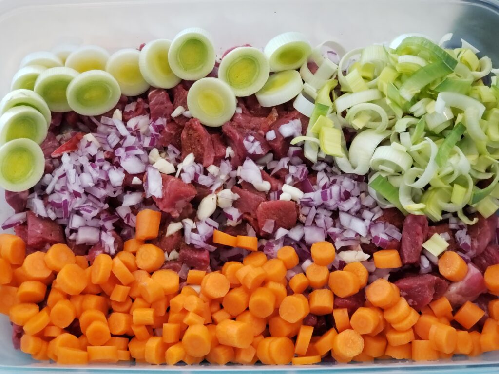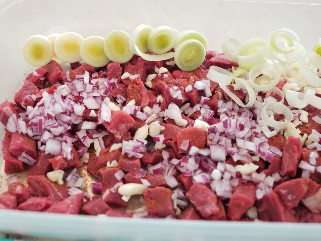 - Dice up onions, garlic, carrots and leeks – add to the steak