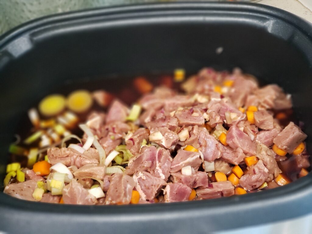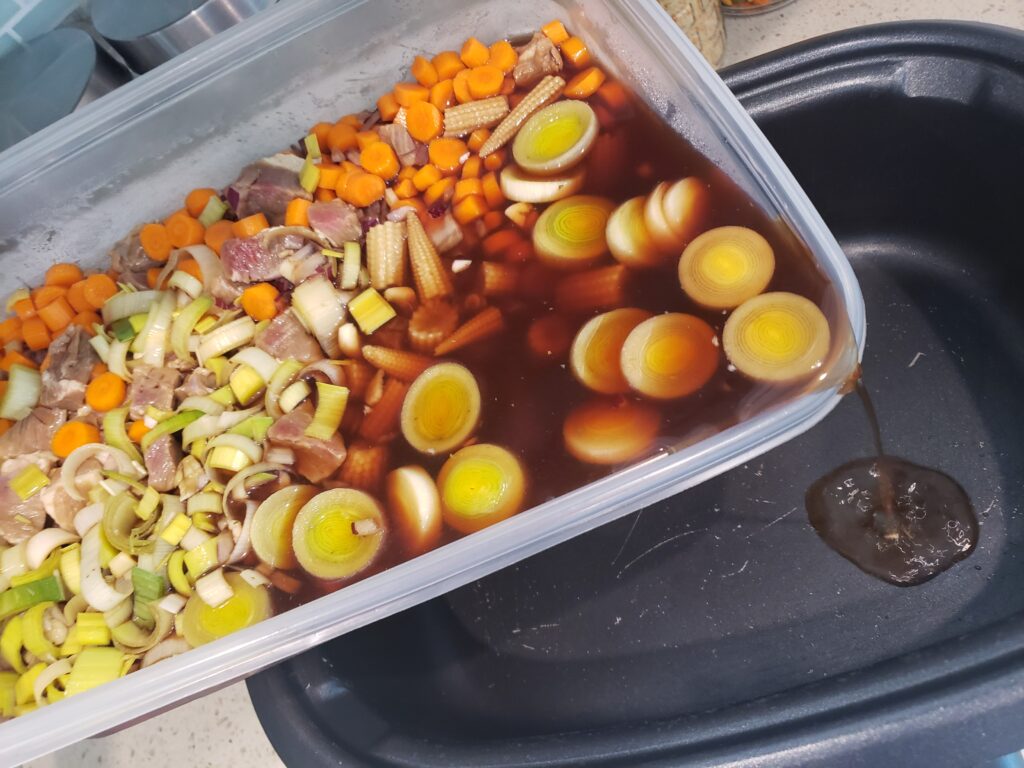 - OVERNIGHT – dice it all up and store in a container in the fridge otherwise you can put directly into the crock pot.