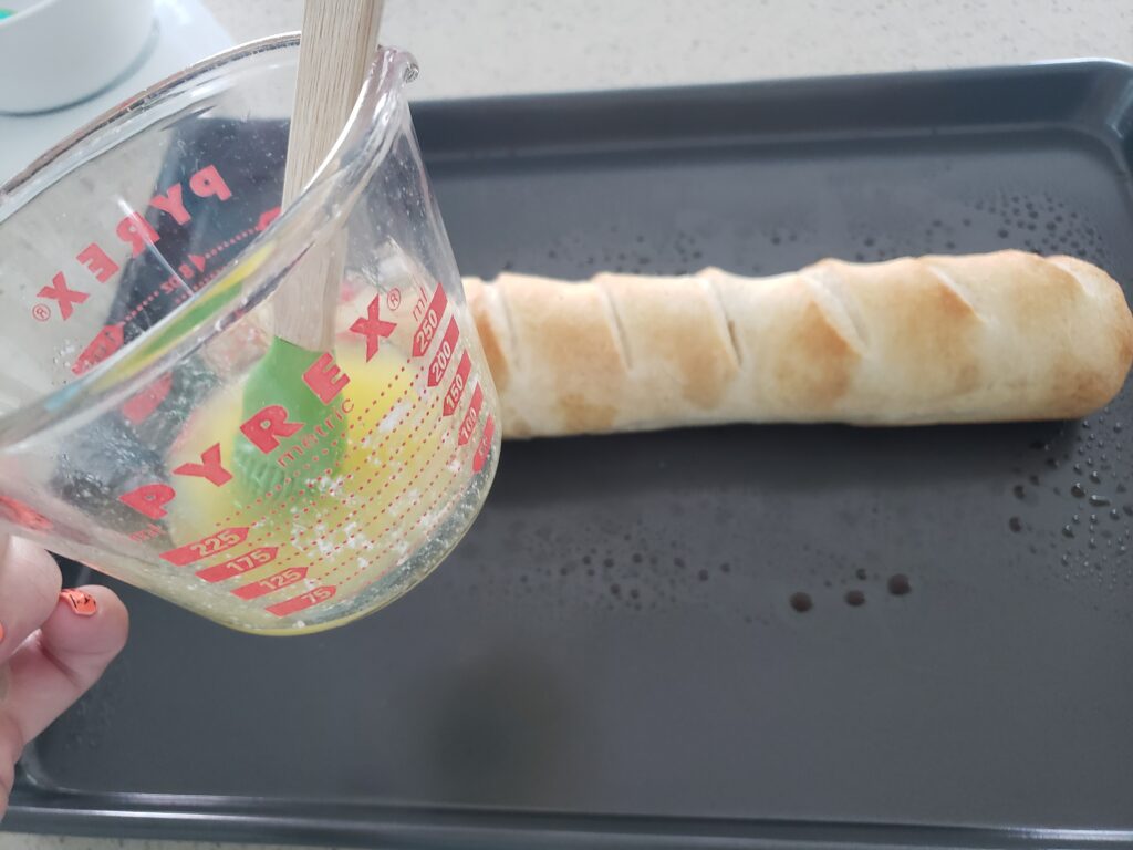 - BUTTER – melt and add garlic salt and Italian seasonings – brush on to the bread