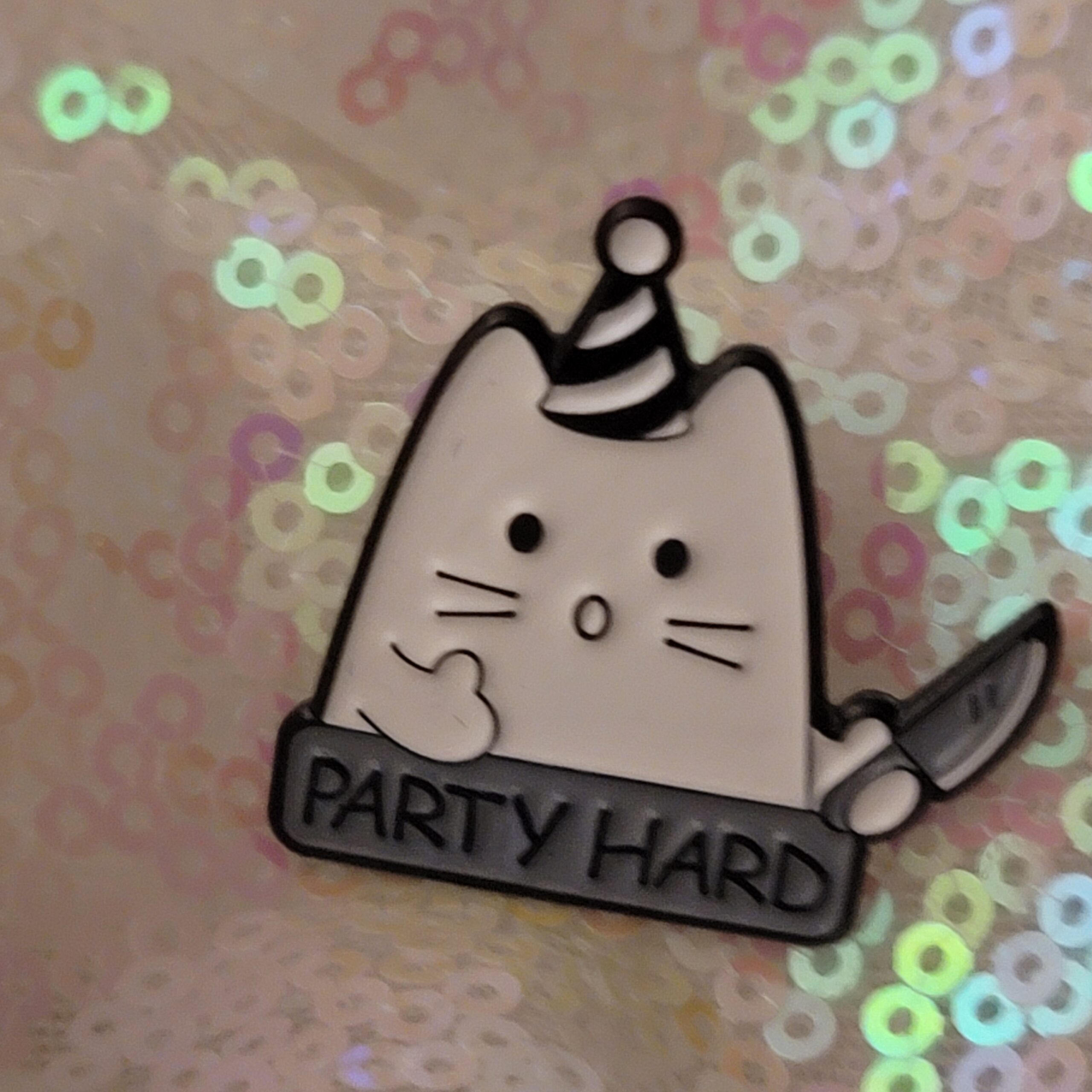 SKU: party hard cat with a knife Category: Pin Tags: anxiety, dangle earrings, pin, ramen, sewing, sunshine