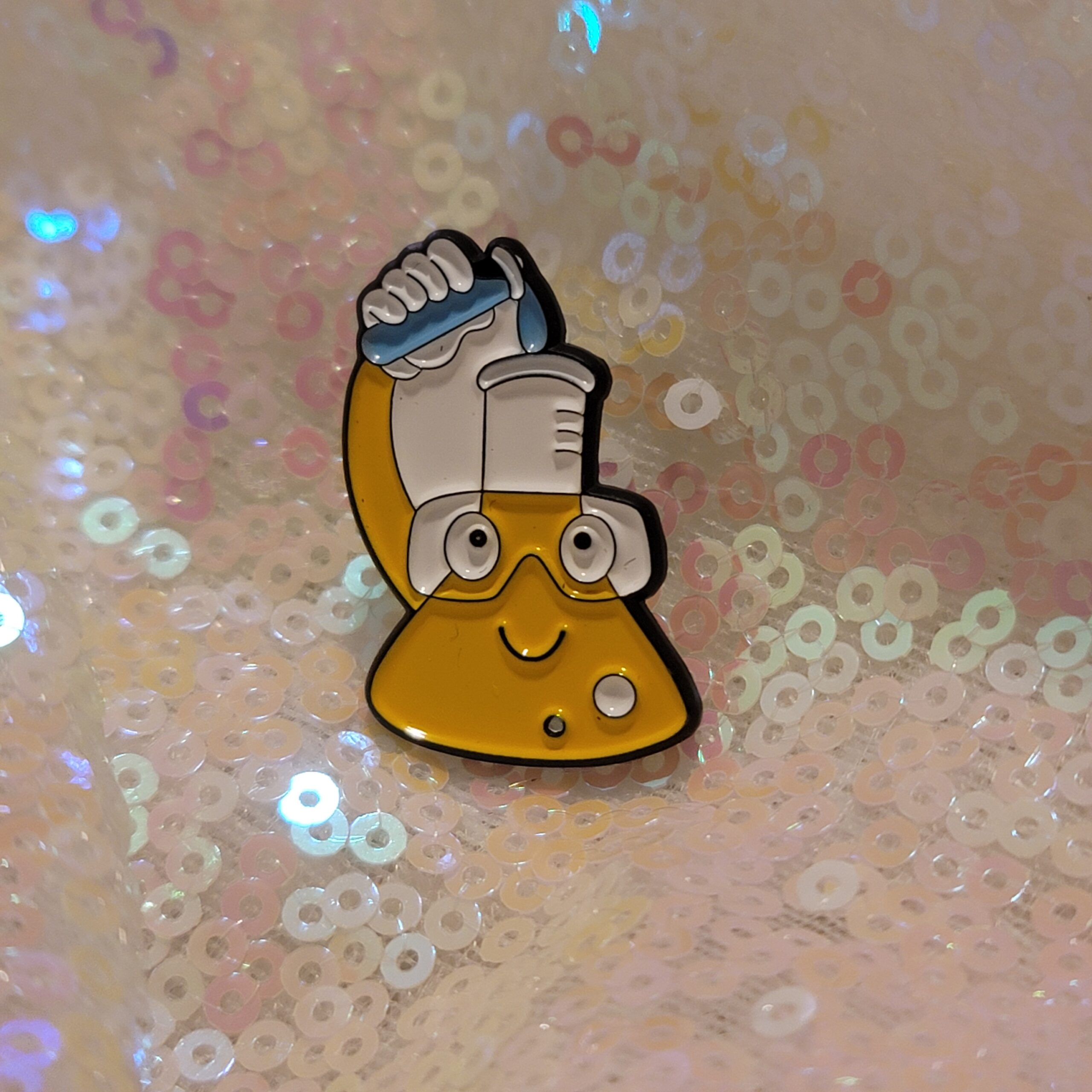 SKU: science beaker filling itself pin Category: Pin Tags: anxiety, dangle earrings, pin, ramen, sewing, sunshine